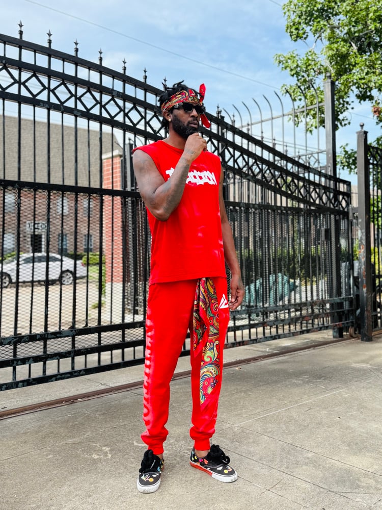 Make a statement without saying a word. The Vandal Code features a vibrant red cotton cut-off cap sleeve t-shirt paired with matching joggers, both elevated by hand-applied custom paint detailing for a one-of-a-kind finish. The breathable cotton tee brings effortless edge with its raw arm seams and relaxed fit, while the joggers deliver all-day comfort with a tapered silhouette and elastic waistband. Finished with a signature logo, this set fuses streetwear attitude with artistic expression — perfect for turning sidewalks into runways.